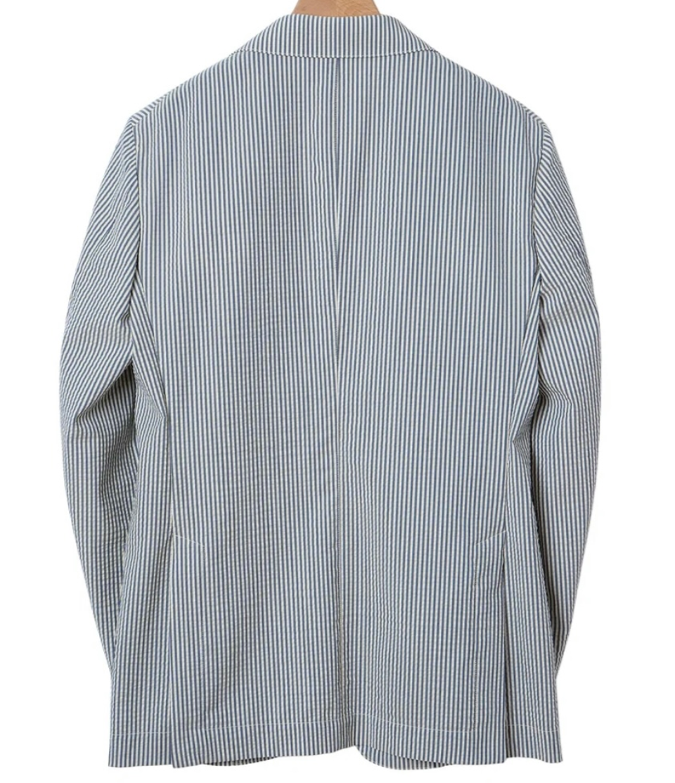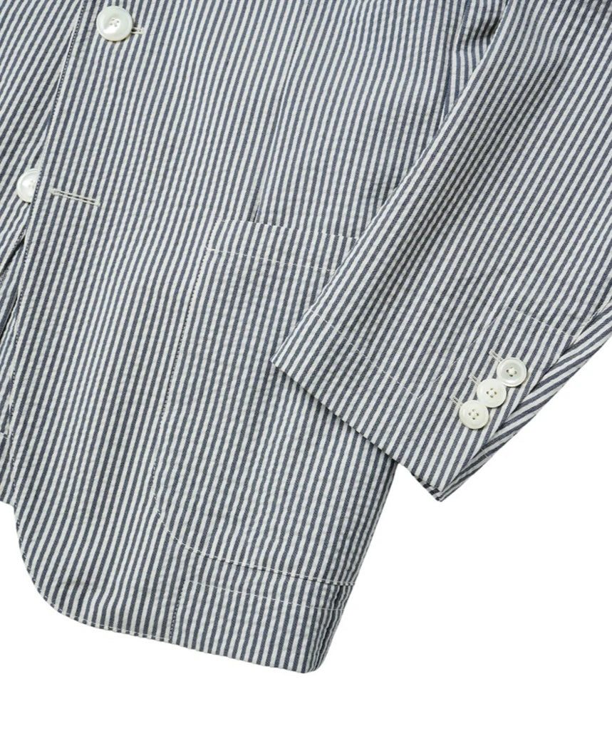 A visually breezy seersucker shirt jacket with a characteristic puckered texture that reduces skin contact, ensuring a light, dry, and non-sticky feel.